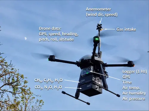 - iUAS-1 (DJI Matrice 300): Single-gas CH₄ or N₂O sensor, anemometer, T/RH/pressure probes; 30 min flights.